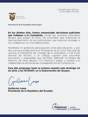 Según manifiesta, el presidente, Guillermo Lasso, las decisiones judiciales en los últimos días han jugado en favor de los criminales, desmantelando las instituciones que deberían proteger a los ciudadanos. Esto, a propósito de las solicitudes de habeas corpus otorgadas al exvicepresidente Jorge Glass y alias ‘JR’, supuesto cabecilla de la banda criminal los Choneros. El presidente por medio de un comunicado oficial, manifestó preocupación ante los últimos sucesos ocurridos en la justicia ecuatoriana.